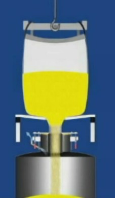 噸袋卸料站通過提升噸袋到物料入口,人工打開噸袋卸料口扎繩,并輔以拍打裝置,促使噸袋內(nèi)的粉粒狀物料靠重力落入緩沖料罐,并通過螺桿輸送來定量完成拆包卸料工作。
